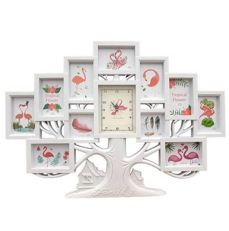 Rama foto din plastic in forma de copac, cu ceas la mijloc si spatii pentru 11 fotografii.